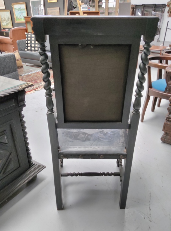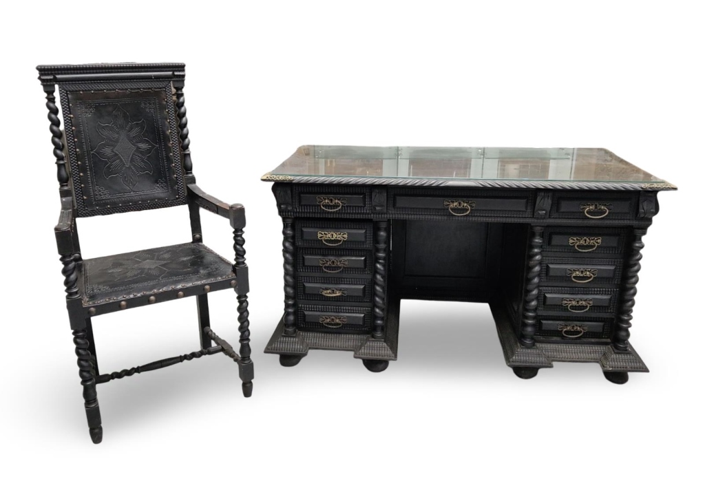 An impressive Baroque Revival writing desk accompanied by a matching leather armchair, crafted in richly finished ebonised wood and decorated with intricate carved detailing.