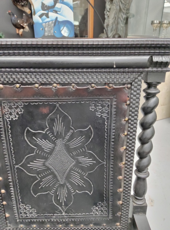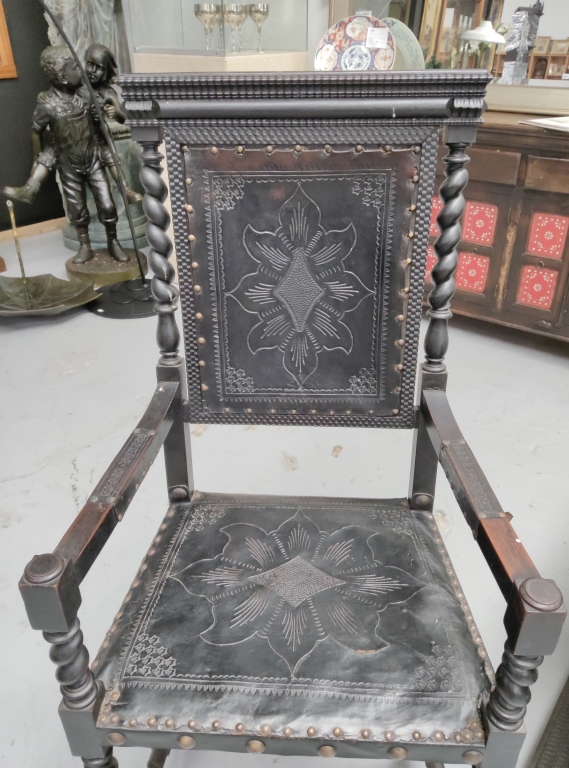 The matching armchair features embossed leather upholstery secured with decorative studs and carved wooden supports with traditional stretchers. Together the pieces create a striking writing suite suitable for a study or executive office.