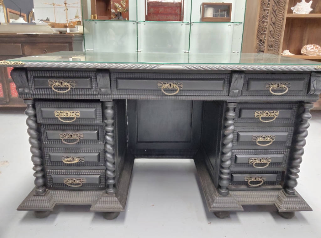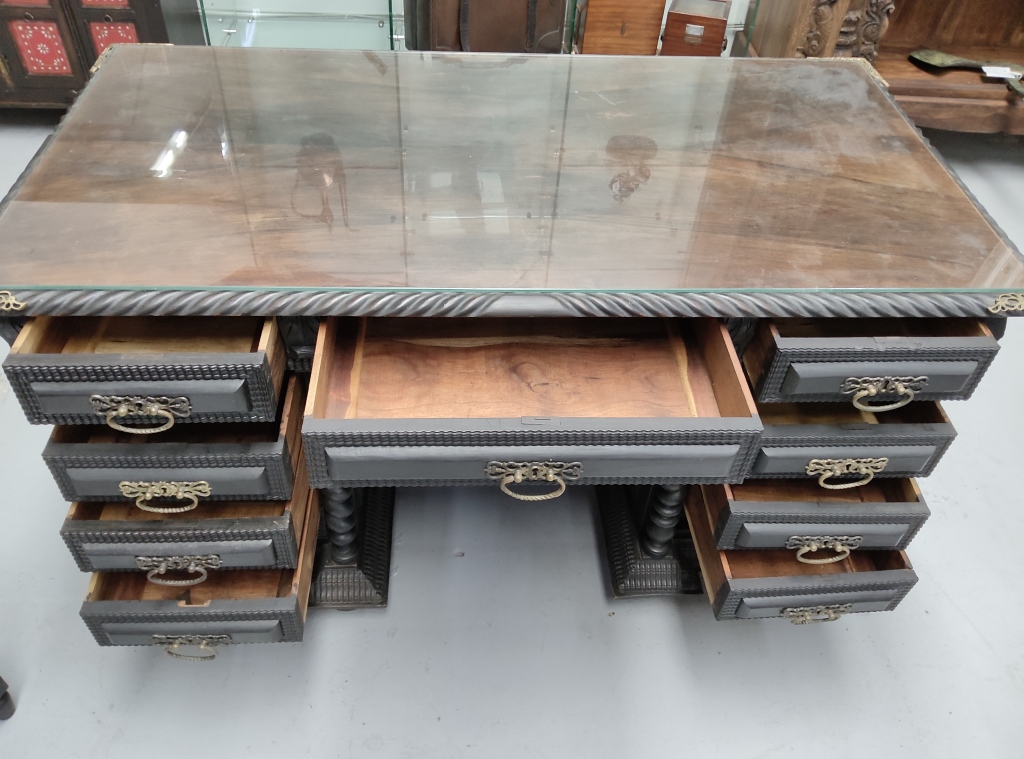 The desk features eleven drawers fitted with brass handles and a series of spiral carved columns supporting the upper section. Carved panels, textured detailing, and geometric embellishments give the desk a strong architectural character.
